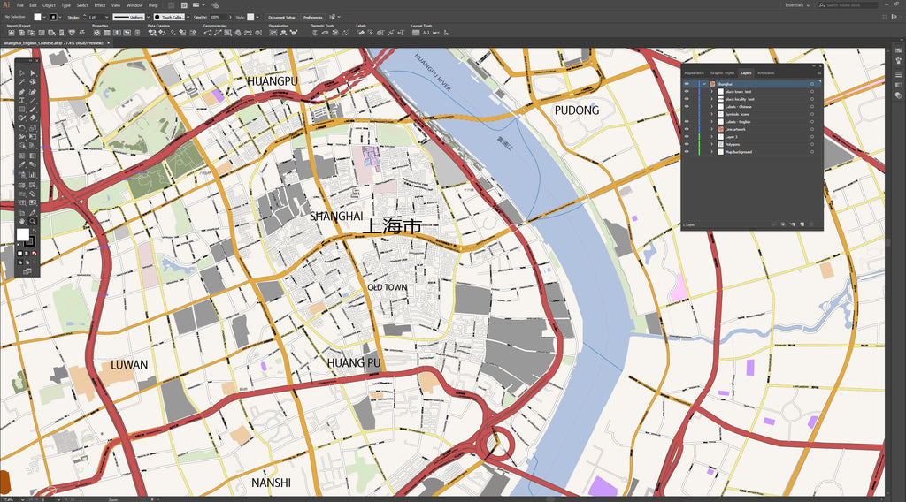 矢量文件格式的上海城市地圖,您可以在自己的設計軟件中進行編輯。 您在街道級別的地形圖包含每個製圖類別的可編輯圖層,如道路,建築物,河流,興趣點等等。 這張上海城市矢量地圖不僅包括市中心,還包括郊區。